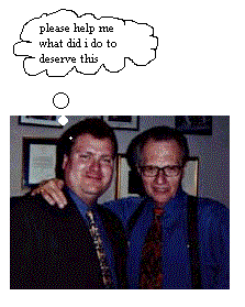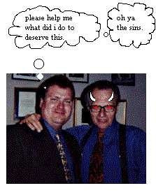 7th ring of Hell (CNN) - Seeing as I'm stepping down as the ruler of hell for a while, (Satan needs vacations too, ya know), I needed someone to take the throne for a while. I found the perfect candidate for this, and decided to do an interview. I recorded it, and transcripted it exactly to this. Enjoy! Satan: Welcome, Larry. Take a seat! (Sizzling sound is heard as Larry King sits down) I had heated up Larry's chair before he came in. It was about 200º Farenheit, and rapidly increasing. Larry King: Hey, my good friend, how's it going? S: Pretty good, lots of people arriving here everday lately, makes for some good torturing. LK: Yeah, same for me up there. So, what did you want to talk to me about? S: Well, I'm going on vacation for a while, and I'm looking for someone to take my throne for a while. LK: And you want me to do that? S: Well, I want to interview you first, but you look pretty good for the job. I hope you don't mind if I record this? LK: Oh, not at all. S: Ok then, let's begin. Have you had any experience with this before? LK: Well, about 16 years on the show, (23 if you count the radio show) plus a lot of random beatings for small animals when I was a child. S: Great! Any big sins I should know about? LK: Well, there's the cloning labs, but I'm not sure if that counts as a sin... S:Well, tell me more about it, and I'll let you know. LK: Well, I've got these labs on an uncharted island in the Pacific...I clone people there for fun. I cloned myself a while ago...but I lost track of him. I've seen reports of a younger looking me having an affair with Michael Jackson, but I can't be sure. S: Most definitely a sin. Very nice one, I might add. LK: Thanks. S: Any others? LK: Well, there was this thing with an anvil, three gerbils, and a piano, but that's not much. S: Yeah, that was a nice one. LK: Thanks again. Of course, there's the brain washing. S: Brain washing? LK: Well, you know how I get all these hot chicks to date me? That's my secret hypnotism skill at work. S: Wow. How does it work? LK: Well, I just talk and talk until they go into a trance, and then I give them post-hypnotic suggestions. I got it from a book by Rush Limbaugh called My Experience In Evilness. S: Never heard of that one. LK: It's an underground book. Only talk show hosts can have it. S: Oh, ok. What is your position on drugs? LK: Every minute you're on tobacco is a minute wasted. S: Oh, really... LK: Yeah, you could be doing hard drugs instead! S: Very nice. I feel the same way about that too. At this point, Larry's clothes were on fire from the burning hot chair. Apparently he didn't notice. S: I've heard rumors that you funded the Harry Potter books. Is this true? LK: Yeah, but it kind of backfired on me. S: How so? LK: Well, I wanted the author to write me some satanic books for the kids. She published the books, and I found they weren't very satanic after all, and she had drawn kids away from the hidden messages on CNN. Not my best decision... S: Well, at least you made the effort, right? Anyway, thank you for your time. I'll be seeing you later. LK: That's it, you're just brushing me off? Just a "Thanks for your time????" Well, not today, buddy! Larry pulled out a shotgun here, and some muffled sounds can be heard on the tape. I'm not sure what happened, it went so fast, but I was up against a wall with a shotgun to my face. LK: I'm going to kill you and take over your throne! I bent the gun with my mind. LK: Umm...uh-oh. S: I was hoping you would do that! You've got the job! LK: ...What? S: Yep, all yours for a month. That was the most evil move you could've made, it's exactly what I would have done! LK: Wow, thanks, buddy! Sorry about the shotgun thing... S: Think nothing of it. Well, I think I'll start watching Larry King's show more often. Could have some interesting hidden messages. |